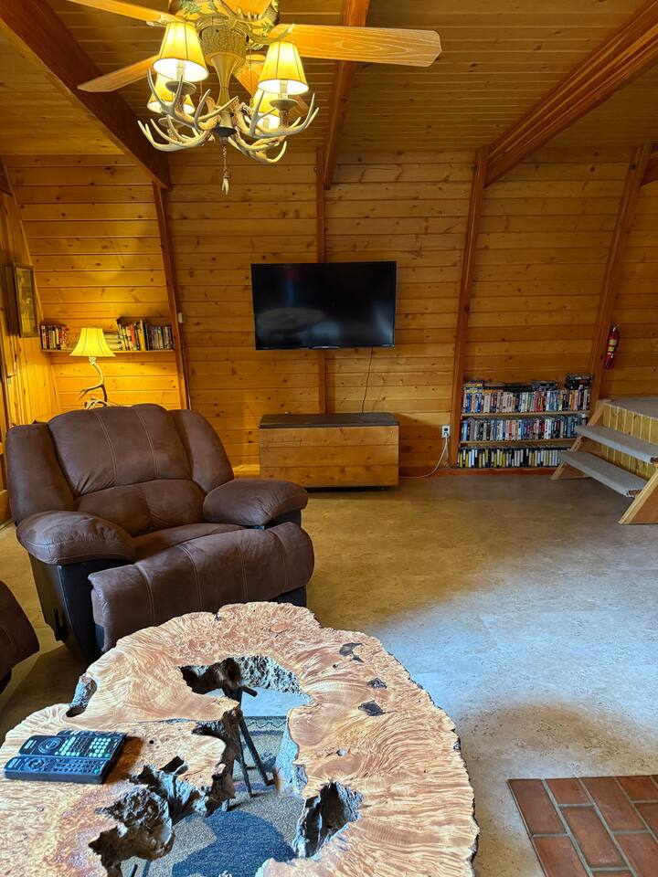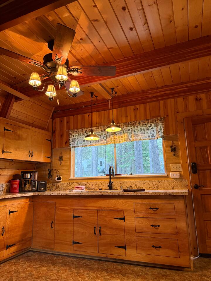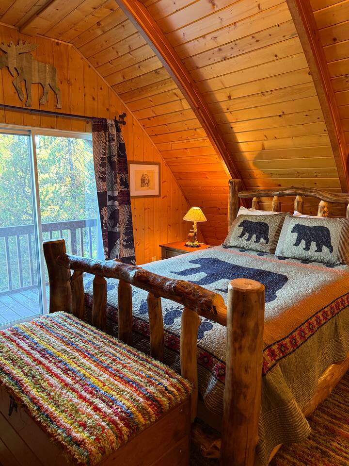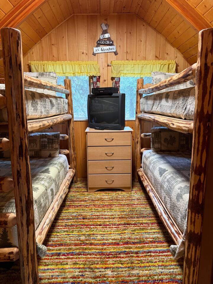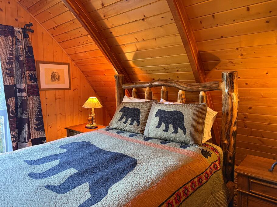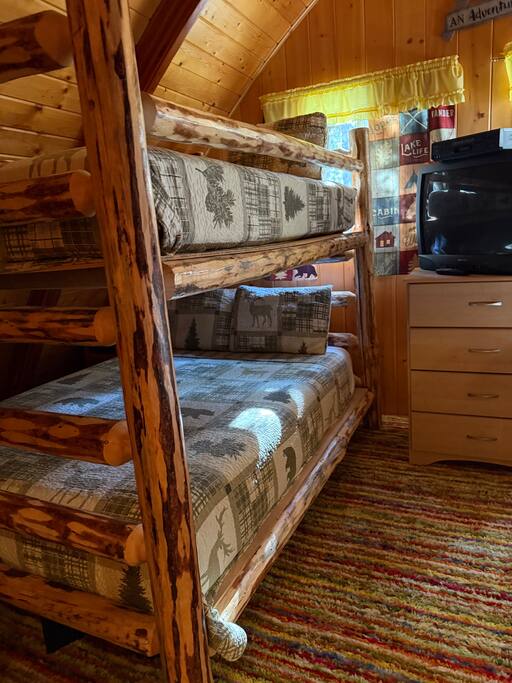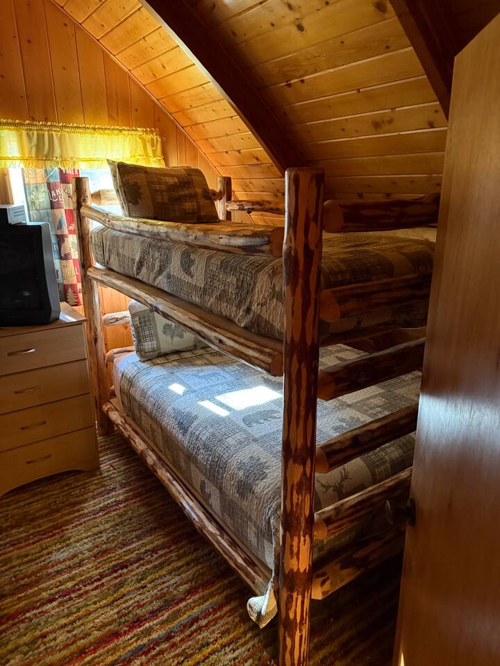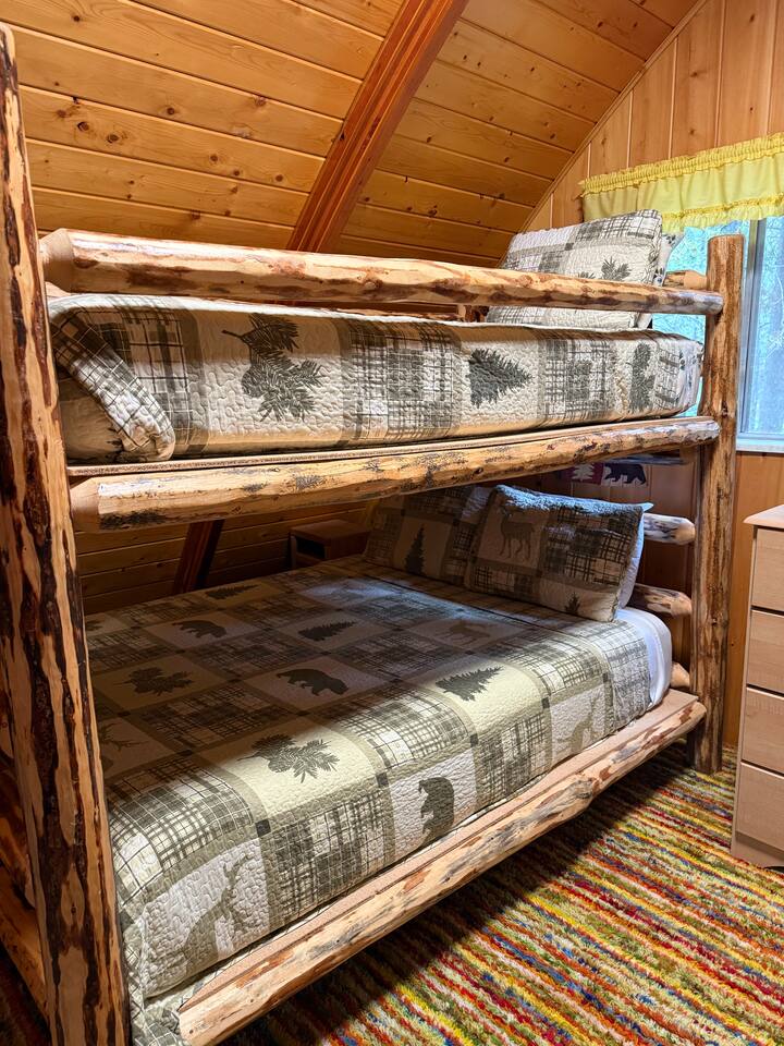Step inside and you’ll find a snug living area perfect for relaxing after a day of exploring. The main floor features a well-equipped kitchen, dining area, and comfy seating—ideal for sharing meals, games, or a cup of cocoa by the fire. Large windows bring in natural light and forest views, making you feel connected to the great outdoors even while indoors. Upstairs, you'll find two bedrooms. One offers a queen bed and a quiet place to rest beneath the eaves. The second bedroom is great for families or groups, featuring two bunk beds—each with a queen on the bottom and a twin on top—providing flexible and comfortable sleeping arrangements for kids or adults. Please note: The staircase to the upstairs bedrooms is steep and best suited for able-bodied guests. Cedar Chalet is the perfect place to unplug and recharge. Whether you're planning a family getaway, a romantic retreat, or a friends' weekend in the woods, this charming cabin delivers the peaceful “cabin in the woods” vibe you're looking for.