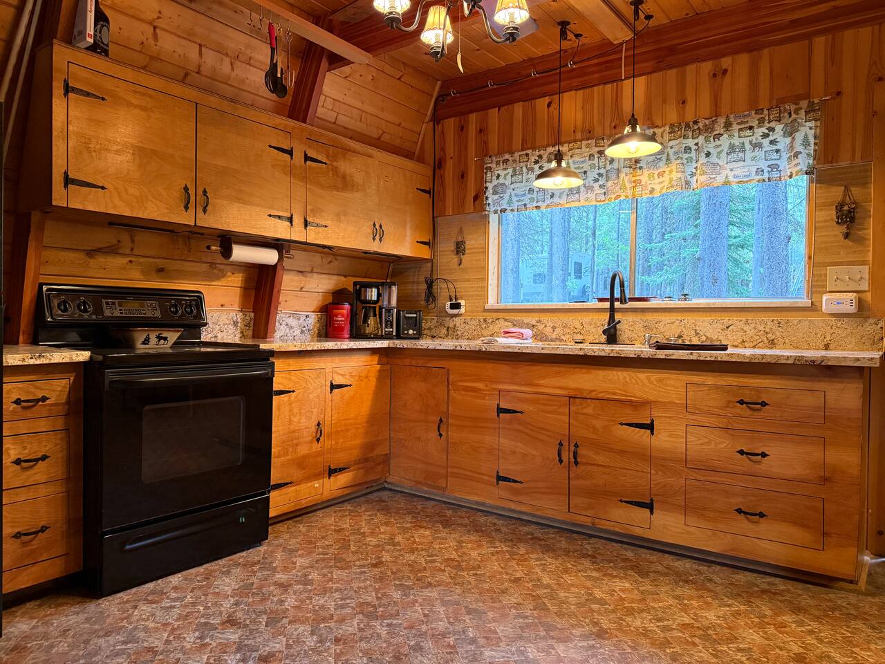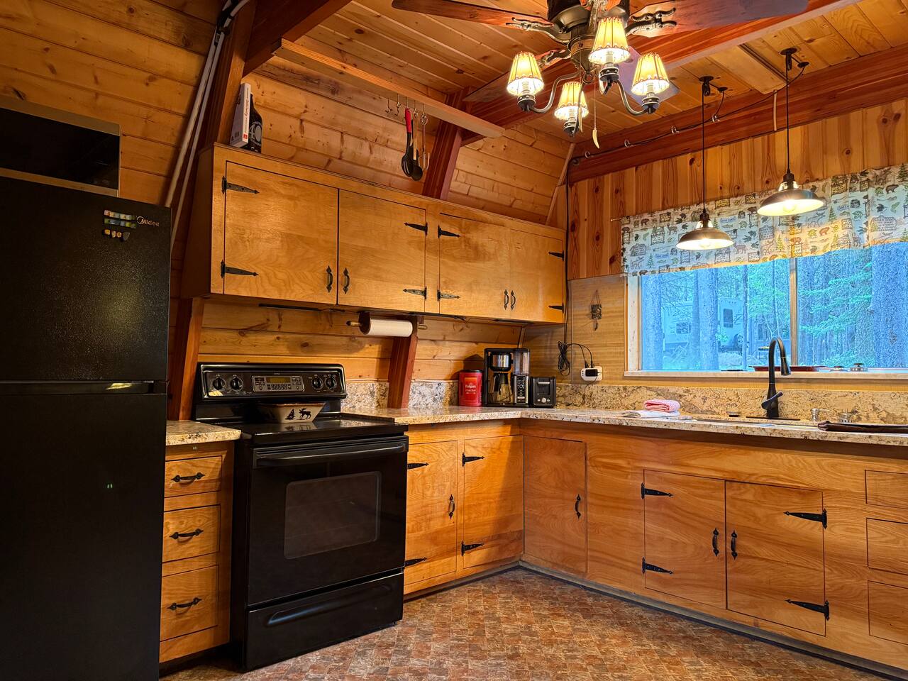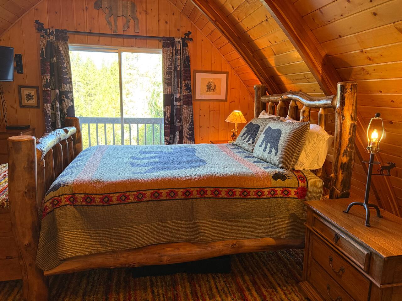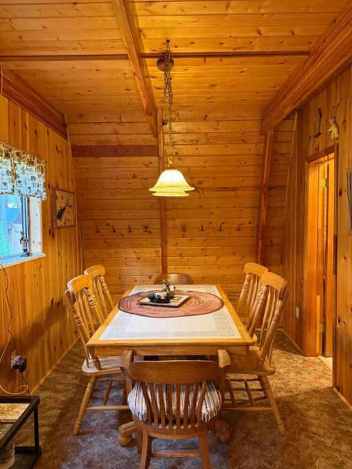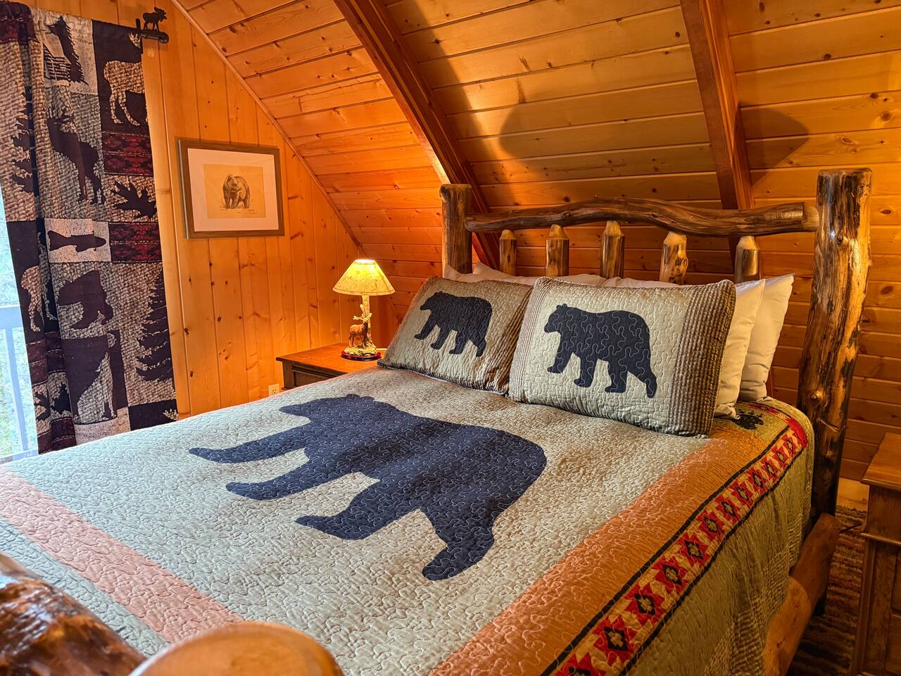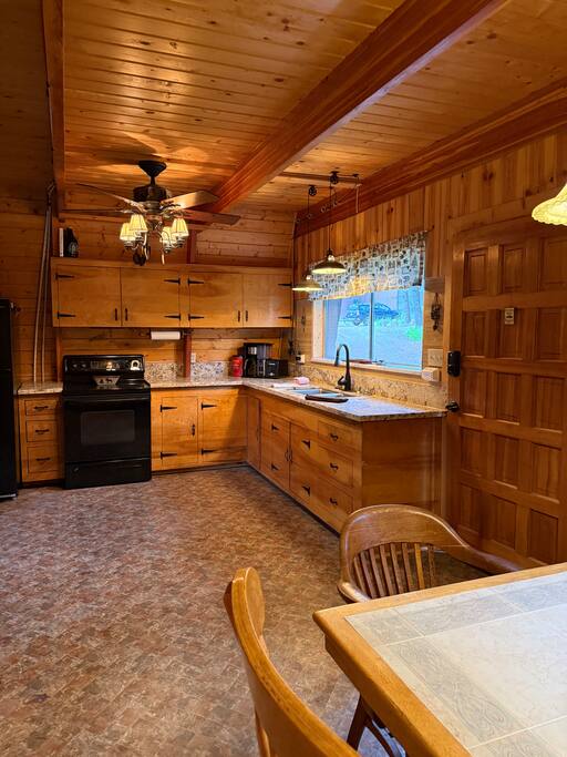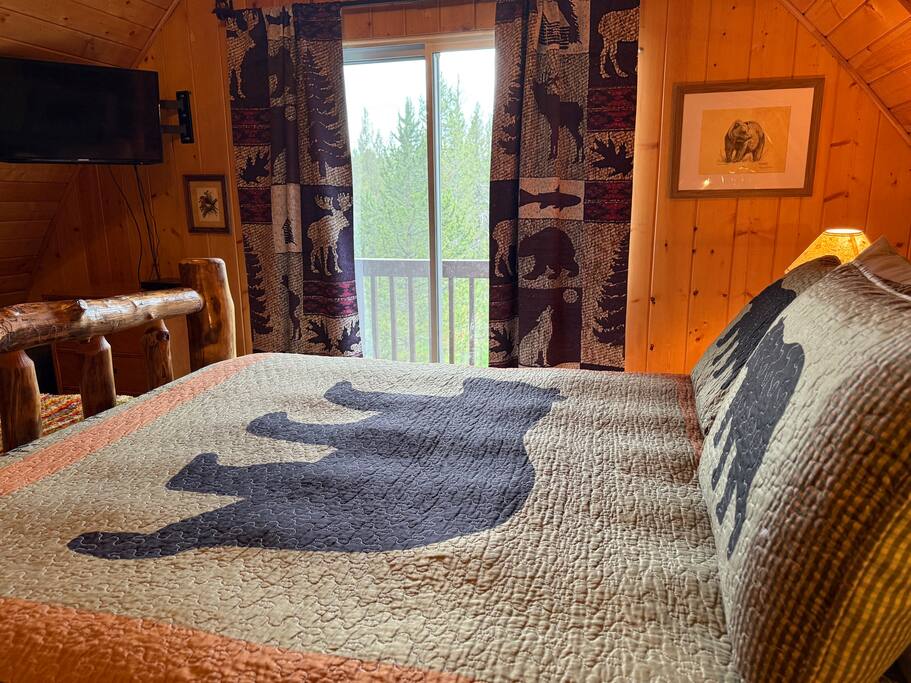 Step inside and you’ll find a snug living area perfect for relaxing after a day of exploring. The main floor features a well-equipped kitchen, dining area, and comfy seating—ideal for sharing meals, games, or a cup of cocoa by the fire. Large windows bring in natural light and forest views, making you feel connected to the great outdoors even while indoors. Upstairs, you'll find two bedrooms. One offers a queen bed and a quiet place to rest beneath the eaves. The second bedroom is great for families or groups, featuring two bunk beds—each with a queen on the bottom and a twin on top—providing flexible and comfortable sleeping arrangements for kids or adults. Please note: The staircase to the upstairs bedrooms is steep and best suited for able-bodied guests. Cedar Chalet is the perfect place to unplug and recharge. Whether you're planning a family getaway, a romantic retreat, or a friends' weekend in the woods, this charming cabin delivers the peaceful “cabin in the woods” vibe you're looking for.