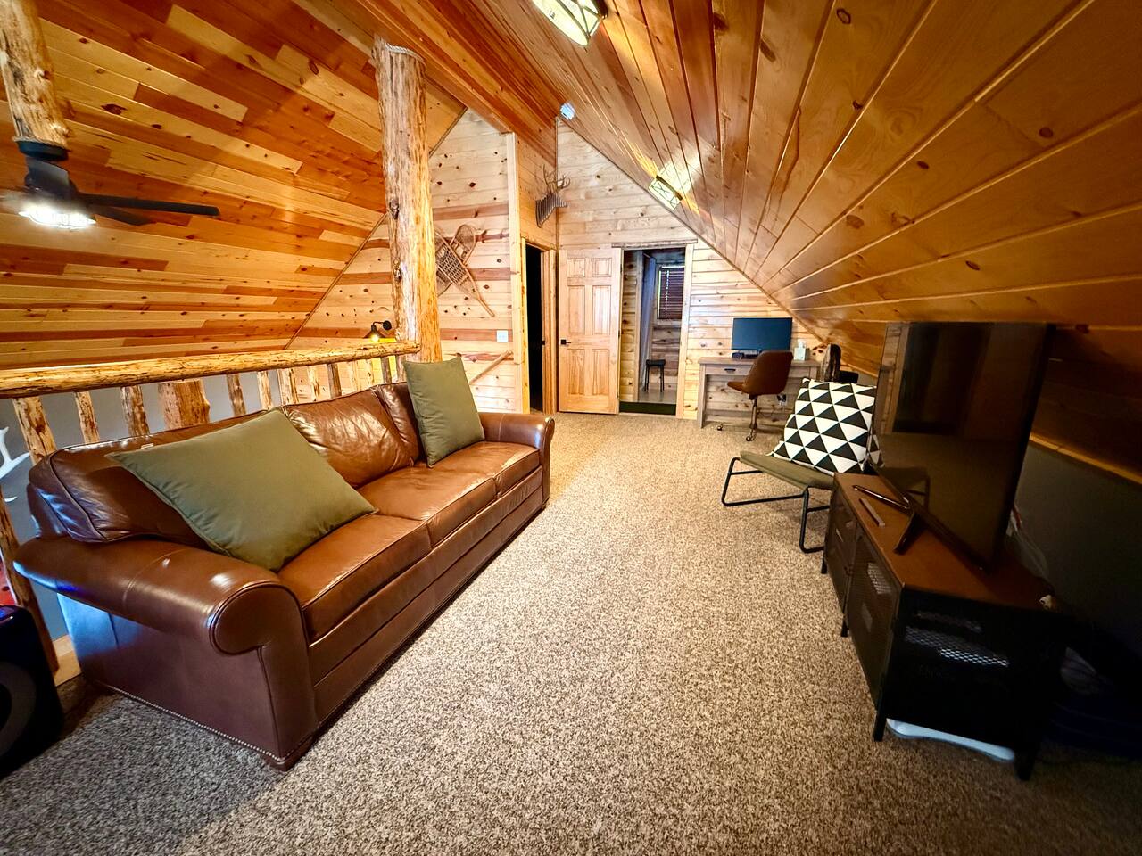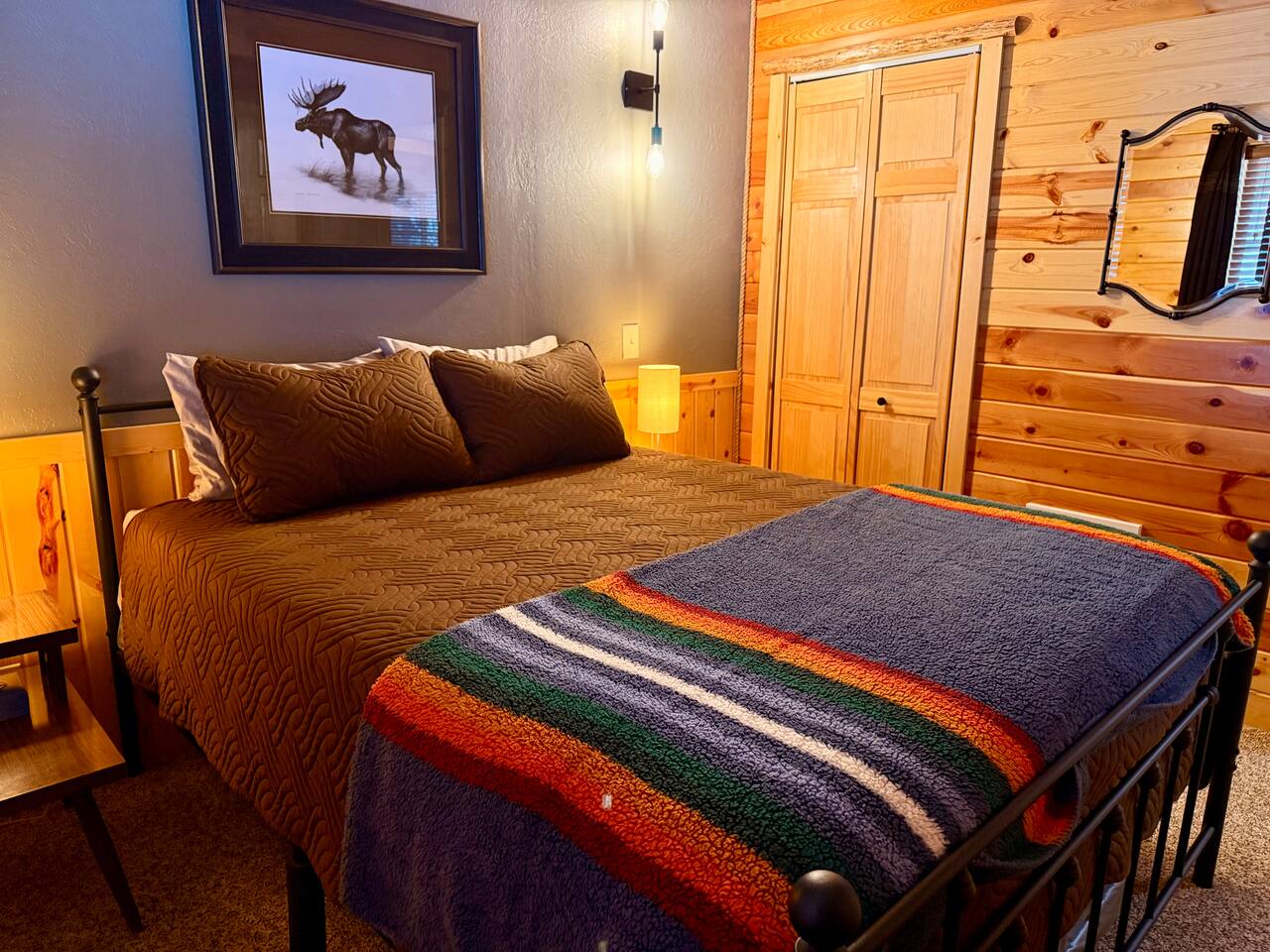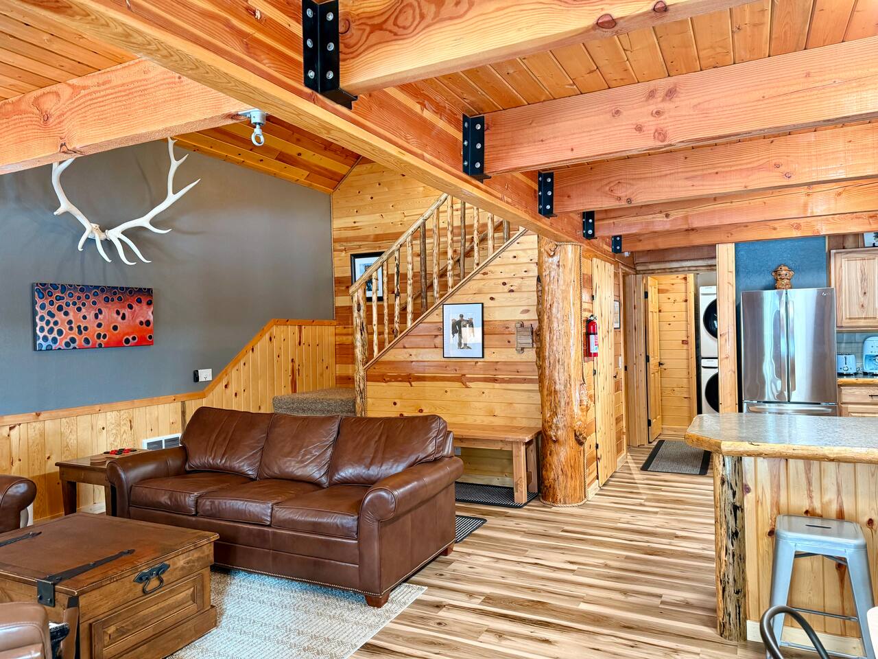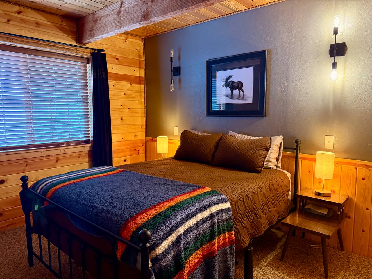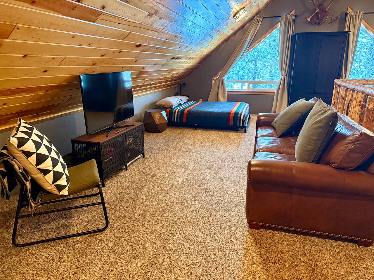 Welcome to Island Park Ranger’s Retreat, a cozy and inviting cabin nestled in the woods, perfect for a family getaway. This charming retreat features two bedrooms, each with a queen bed for a restful night’s sleep. The master bedroom is conveniently located on the main floor, along with a well-equipped kitchen, a full bathroom, and a warm, open living area. Upstairs, you’ll find a second private bedroom with a queen bed. The open loft area provides additional sleeping space with two queen beds and an optional pullout couch, making it ideal for larger families or groups. Thoughtful woodwork details throughout the cabin create a rustic yet cozy atmosphere, offering the perfect place to unwind and make lasting memories. Whether you're here for adventure or relaxation, Island Park Ranger’s Retreat is the perfect home away from home.