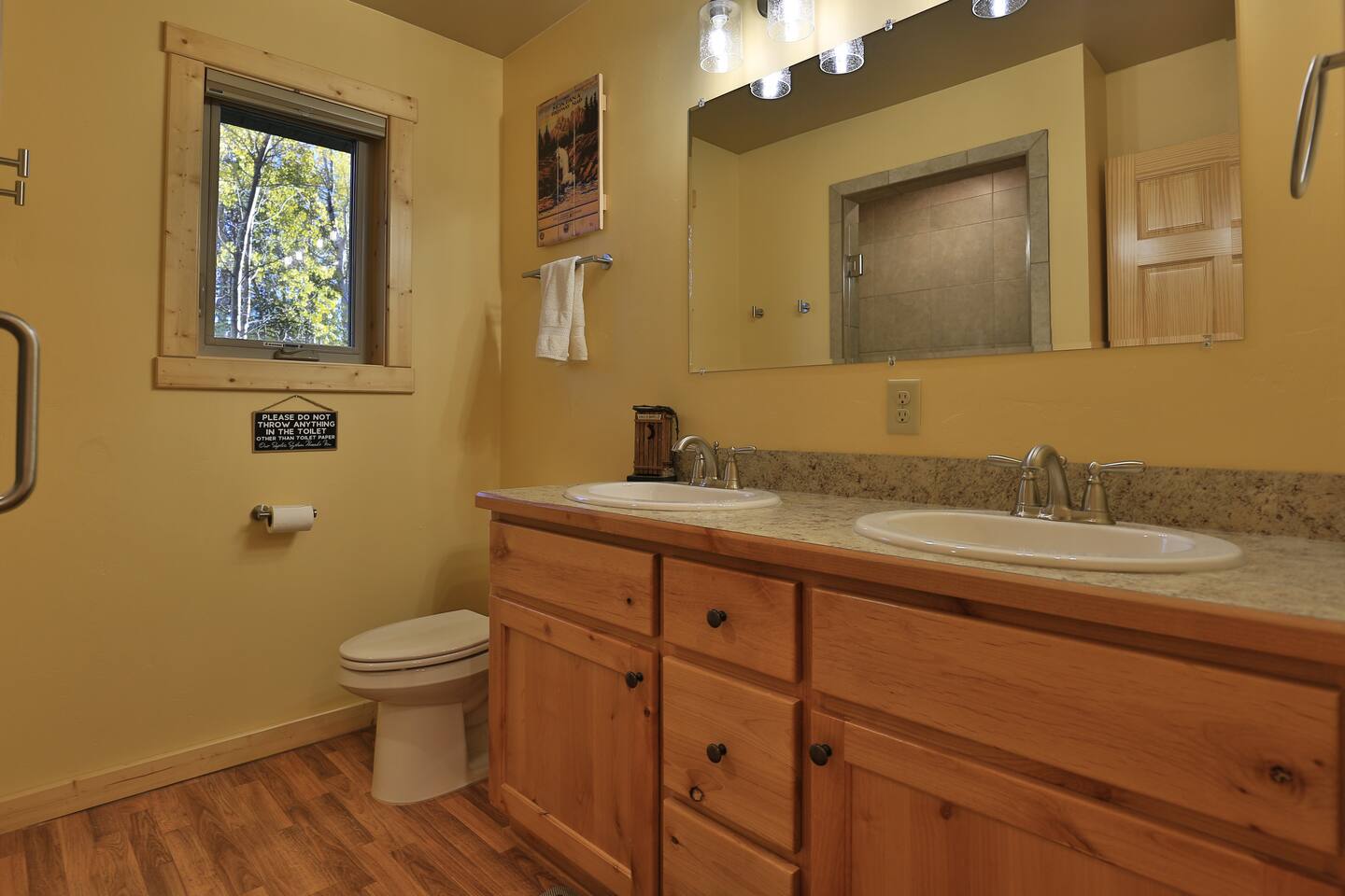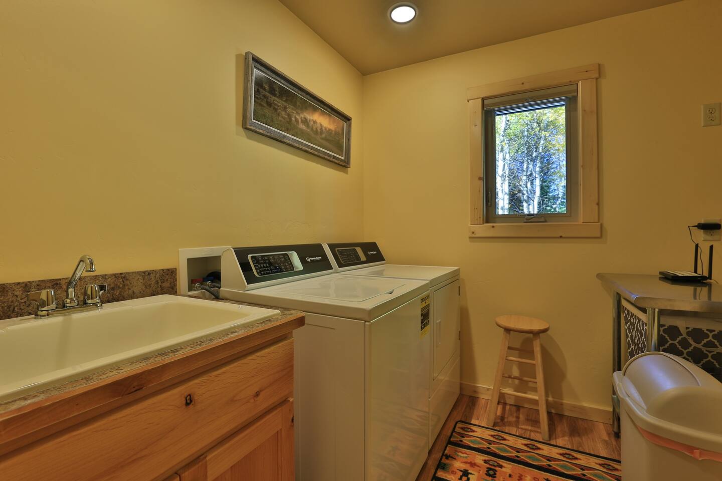Inside the cabin, you’ll find an open living area with comfortable seating, a full kitchen stocked with cookware and essentials, and a dining space great for shared meals or board games. There are two bedrooms: one with a king bed and one with two twin beds. The cabin also includes a full bathroom with a shower/tub combo and a laundry room with a washer and dryer for guest use (detergent provided). The outdoor space features a sitting area surrounded by trees and a small firepit — perfect for roasting marshmallows and relaxing in the evenings. Fire use may be limited during fire-danger seasons. The cabin is located in a quiet, wooded area with easy access to Highway 20. It’s an ideal stay for families, couples, and Yellowstone explorers. Wi-Fi is available, though speeds may vary due to the remote mountain location. Parking is available for multiple vehicles or trailers.